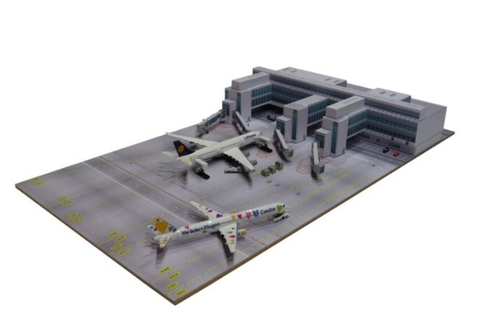 On two narrow plates (each 20 x 40 cm / 7.9 x 15.7 in) are two sections that connect to the central plaza. Or you can place one of these sections between the northern and southern piers, without adding the plaza. Depending on the airplane type, a maximum of three models can be placed on each of the two sections.