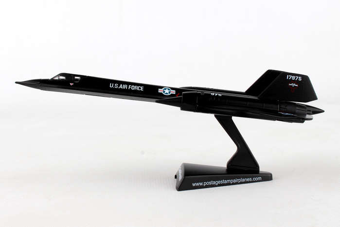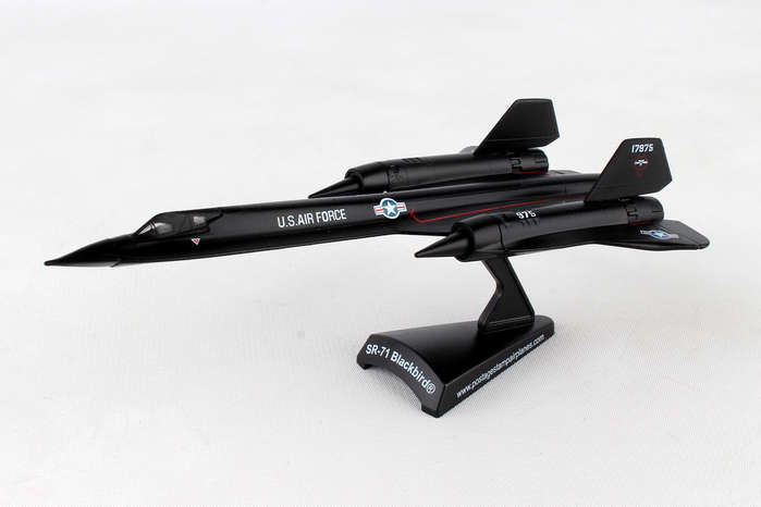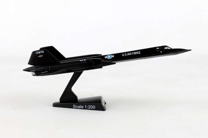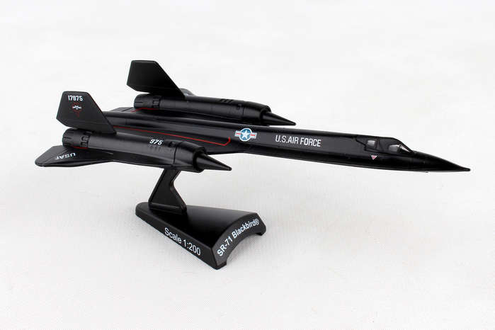 After 30 years in service the Blackbird still looks like a 21st century aircraft. The SR-71's mission was strategic reconnaissance. One of the fastest planes ever built, it reached a top speed of more than 2,200 mph at an altitude of 80,000 feet. At this altitude, the crew needed to wear special pressurized suits and helmets and required 100% oxygen to survive. Because of its unique look and technological achievements, this aircraft is a favorite among aviation enthusiasts. This die-cast metal model comes in 1:200 scale with plastic stand and is approximately 6 3/16 inches long with 3 3/16 inch wingspan. Adult Collectible ages 14+