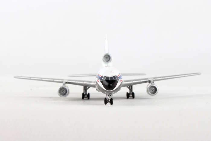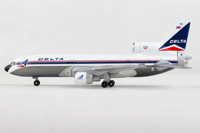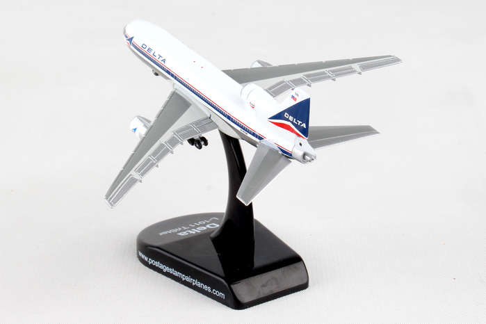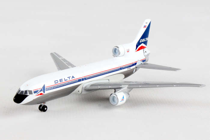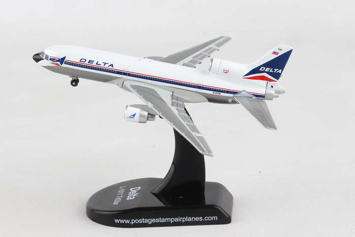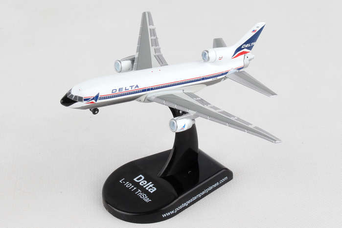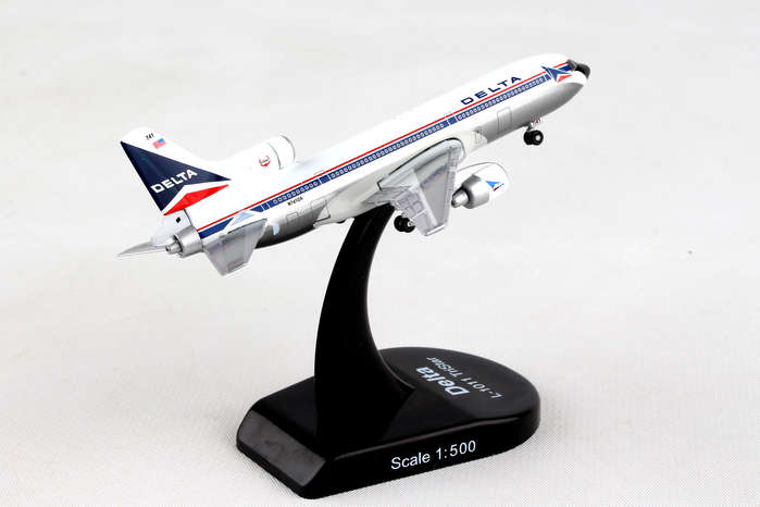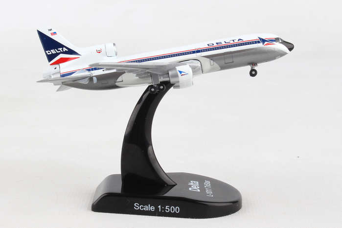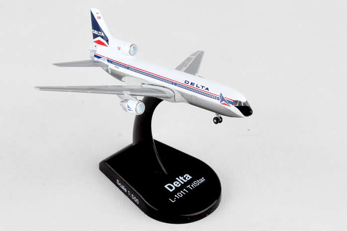 L-1011 TriStar is a commercial aircraft made by Lockheed Corporation between 1968 and 1984. Its trijet configuration has one engine under each wing and a third engine mounted in the junction of the tail and the upper fuselage. TriStar was the most technologically advanced commercial jet of its time, the first airliner capable of flying itself with automatic flight control system (AFCS) and autoland capability. The aircraft has a seating capacity of up to 400 passengers and available lower deck galley and lounge facilities, with a range of over 4,000 miles. Delta Airlines had the biggest L-1011 fleet in the airline industry, with a total of 70 TriStars. They flew in Delta's "Wide-Ride Fleet" to 79 domestic and international cities, including Delta's first trans-Atlantic and trans-Pacific destinations. Delta retired the L-1011's in 2001. This Die-cast metal airplane model comes in 1:500 scale with plastic stand and is approximately 4 inches long with 4 inch wingspan. Adult Collectible ages 14+