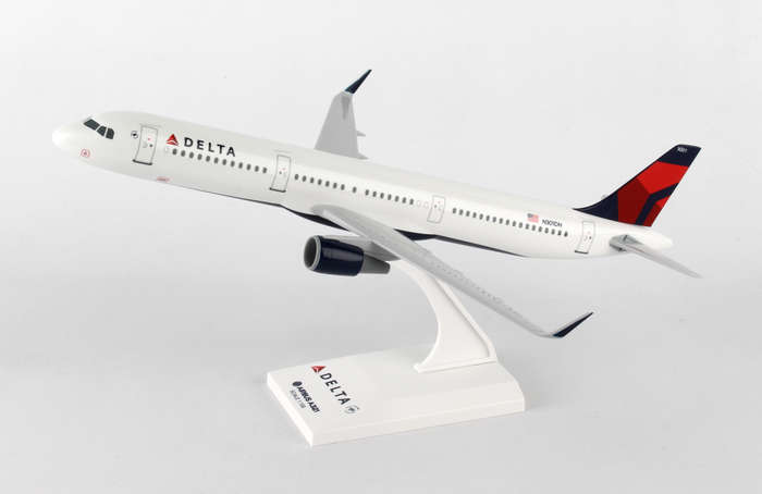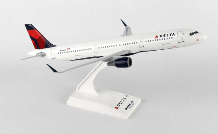Comprising superior quality, substantial, solid injection molded plastic components with a simple snap-fit design that allows for easy assembly without the need for glue, this SkyMarks 1/150 Scale Delta Airlines Airbus A321 - with Registration N301DN - measures approximately 11-5/8-inches long with a 9-5/8-inch wingspan and comes complete with a Display Stand. An accurate, true-to-scale reproduction of the actual aircraft, the model is great for collectors and features authentic, highly detailed graphics and markings. A derivative of the Airbus A320 with a stretched fuselage, the Airbus A321, which went into service in 1994, is a narrow body, short to medium range commercial jet that can be configured to typically carry 185 to 236 passengers. To give the Airbus A321 full-transcontinental range with maximum passenger capacity, Airbus began development of the next version of its A321 in 1995, the A321-200, that went into service in 1997 as a larger and heavier aircraft than the earlier A321 with minor structural strengthening modifications, higher thrust engines, and additional fuel