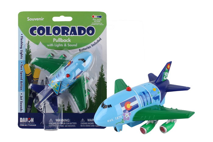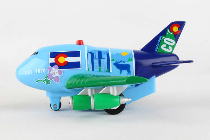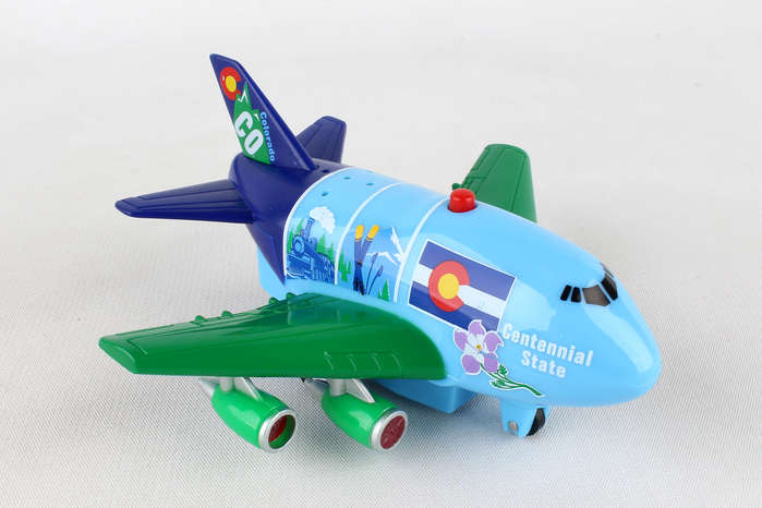 This stylized aircraft toy features electronic jet sound and flashing red lights, activated by the push of a button on top of the plane. Just pull the plane back and watch it go, speeding forward in the take-off position! Features two-speed action. Celebrate the "Centennial State," Colorado with this pullback airplane toy that moves and features lights and sounds! Colorado got its "Centennial State" nickname because it officially became a state 100 years after the Declaration of Independence was signed. This fun toy commemorates this great state with a design that includes its flag, the state flower (Colorado Blue Columbine), the Rocky Mountain Elk, and more. This 1.7 oz. toy measures 2 1/8" tall by 4" long, 4 1/4" wide and weighs 1.7 oz. Batteries are included. For children ages 3+.