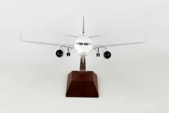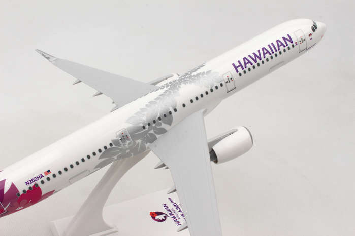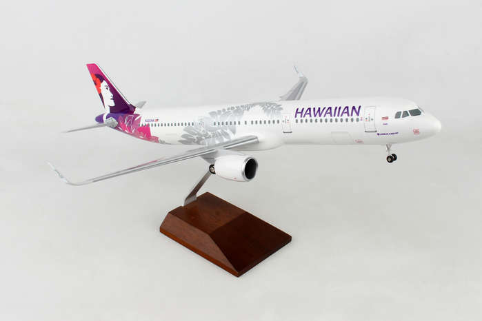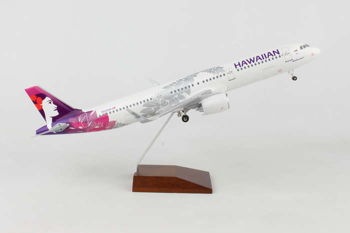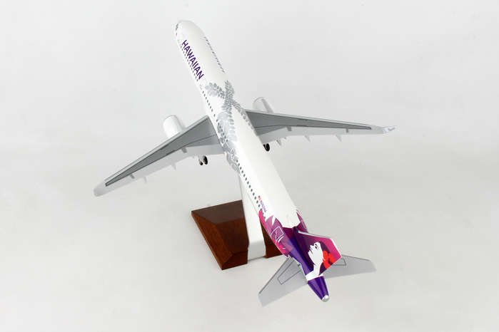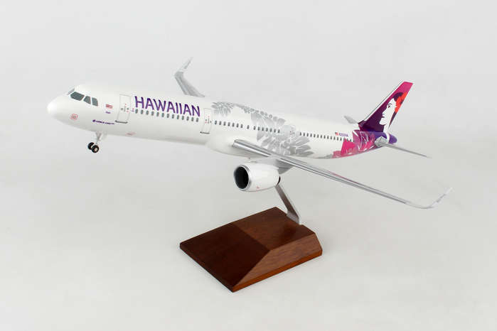 This Hawaiian Airlines A321 features solid fuselage, injection molded plastic construction with highly detailed graphics. Model comes with landing gear, spinning engines & rich wood display stand. Full model can be assembled in minutes! The airplane model is approximately 17.5 inches in length and has a 13.5 inch wingspan.