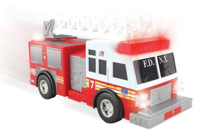 This FDNY motorized ladder truck has lights and sound action. Just press the buttons and the truck races accross the floor with siren/lights. Requires 3 AA batteries (included). Mute switch for quiet play. Item is approximately 11 inches long, 4 inches wide and 6 inches tall. Working ladder. Ages 3+